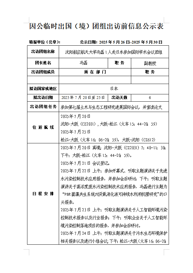 应第七届土木与生态工程研究进展国际会议的邀请,万象城拟派冯磊同志于2025年7月20日至7月25日赴日本参加第七届土木与生态工程研究进展国际会议。现就此计划予以公示。公示日期:2024年5月26日-5月30日。如有异议,可在公示期内与AWC万象城娱乐联系,电话:024-89724878,邮箱:foreignaffairs@sau.edu.cn。