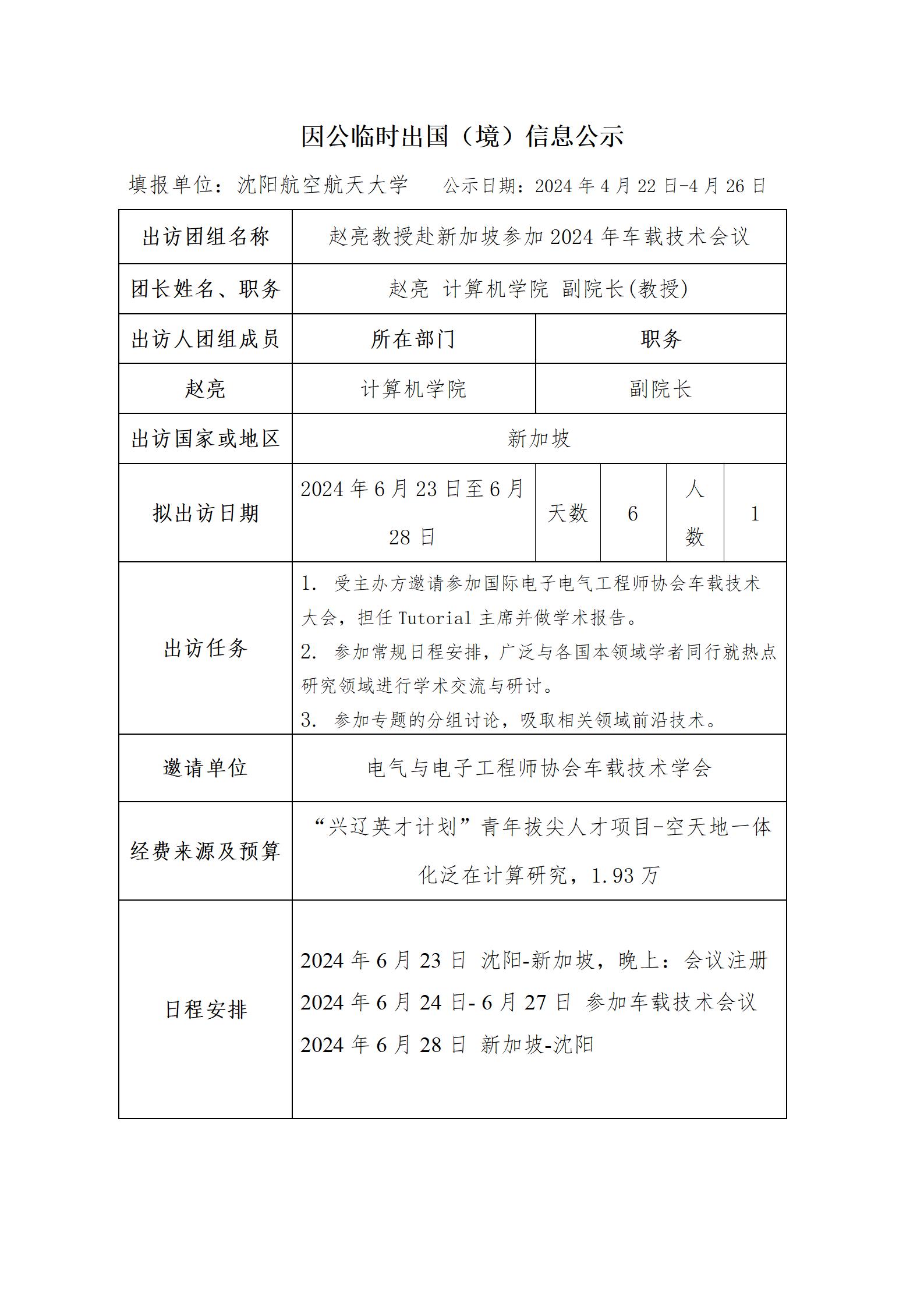 应电气与电子工程师协会车载技术学会的邀请,万象城拟组派赵亮同志于2024年6月23日至6月28日赴新加坡参加2024年车载技术会议。按照省外办有关最新管理规定,现就此计划予以公示。公示日期:2024年4月22日-4月26日。如有异议,可在公示期内与外事处联系,电话:024-89724878,邮箱: foreignaffairs@sau.edu.cn 。