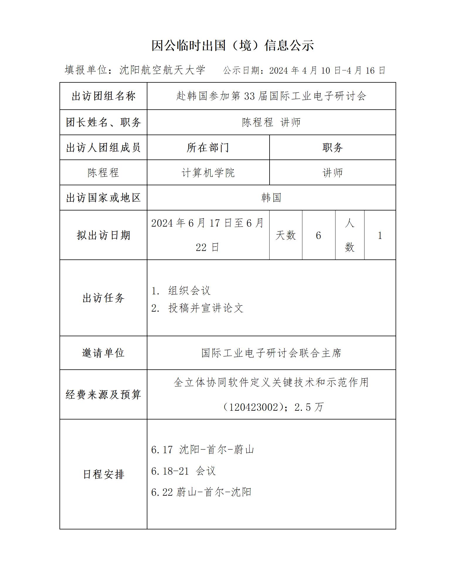 应国际工业电子研讨会联合主席赵康贤的邀请,万象城拟组派陈程程同志于2024年6月17日至6月22日赴韩国作为特邀会议组织者参加2024年第33届国际工业电子研讨会,并做会议报告。按照省外办有关最新管理规定,现就此计划予以公示。公示日期:2024年4月10日-4月16日。如有异议,可在公示期内与外事处联系,电话:024-89724878,邮箱: foreignaffairs@sau.edu.cn 。