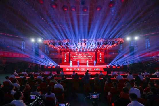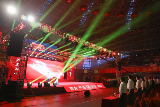 会场内华灯璀璨,“不忘初心、牢记使命”“波澜壮阔70载,逐梦启航新时代”的巨大舞台背景庄严隆重,讴歌了新中国成立70年来中国共产党带领全国人民取得的伟大成就。