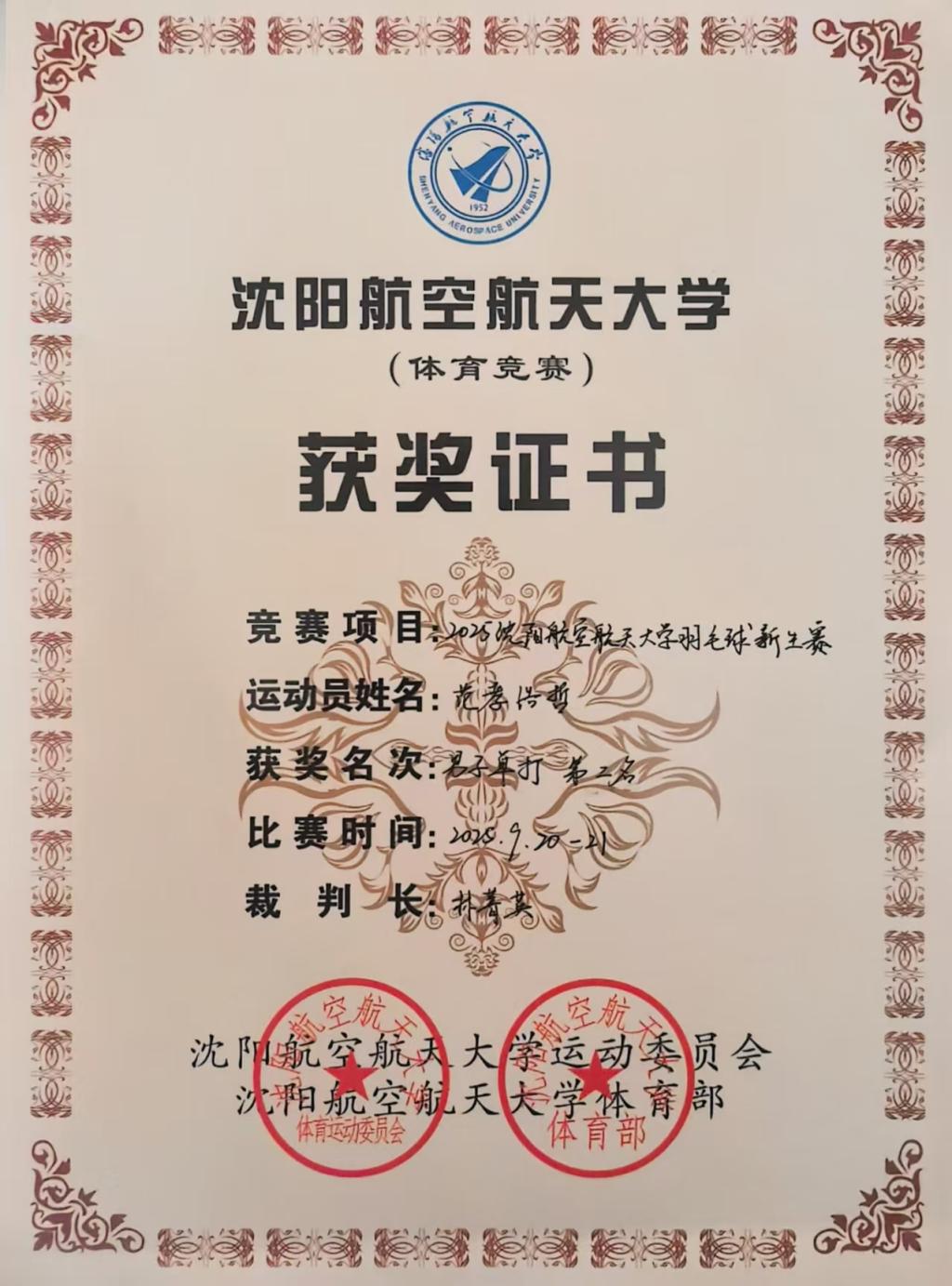 在羽毛球比赛中,万象城男子单人比赛项目也取得了佳绩,飞制 2512 范孝浩哲获亚军、自动化 2511 杜帅锟获8强佳绩、飞动 2513 杨天石获16 强佳绩。